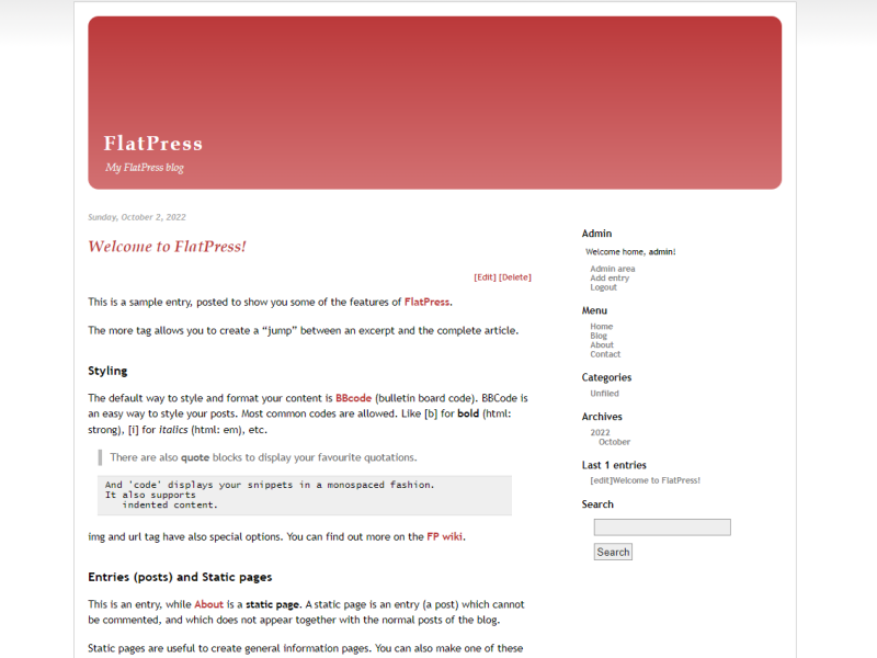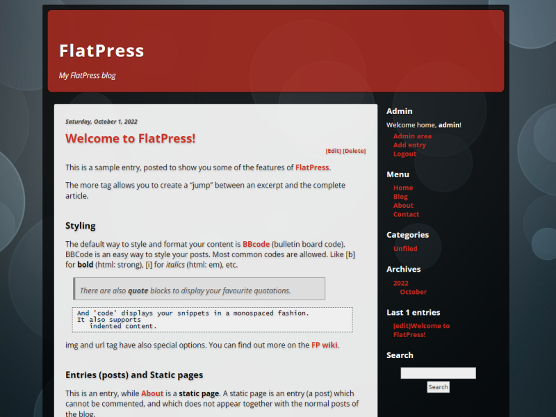 Statické stránky jsou užitečné při vytváření stránek s obecnými informacemi. Jednu z těchto stránek můžete také nastavit jako úvodní stránku pro své návštěvníky. To znamená, že s FlatPress můžete provozovat také web, který není blogem. Možnost vytvořit ze své statické stránky úvodní stránku je v panelu možností v oblasti administrace webu.